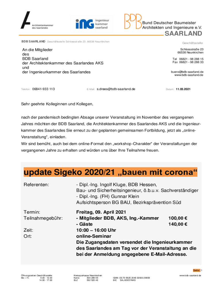 SAARLAND BDB SAARLAND Geschftsstelle Schlossstrae 23, 66538 NeunkirchenGeschftsstelle: Schlossstrae 23 66538 NeunkirchenAn die Mitglieder des BDB Saarland der Architektenkammer des Saarlandes AKS