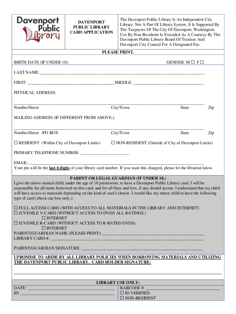 DAVENPORT PUBLIC LIBRARY CARD APPLICATIONThe Davenport Public Library Is An Independent City Library, Not A Part Of Library System. It Is Supported By The Taxpayers Of The City Of Davenport, Washington.