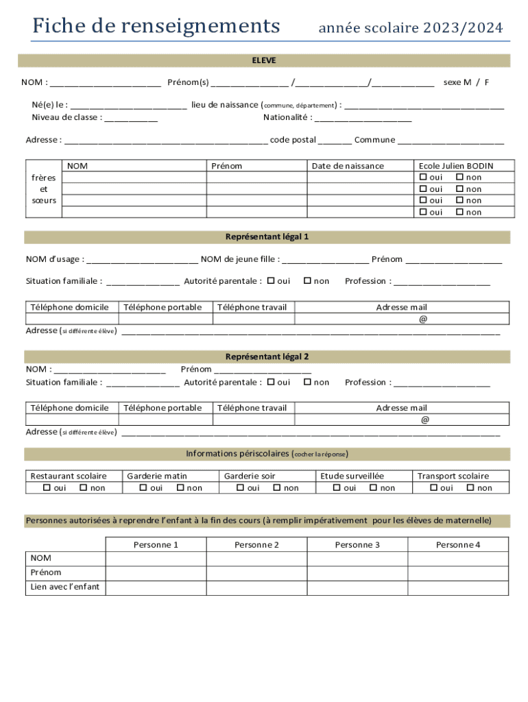 Fiche de renseignementsannee scolaire 2023/2024ELEVE NOM : ___ Prnom(s) ___ /___/___ sexe M / F N(e) le : ___ lieu de naissance (commune, dpartement) : ___ Niveau de classe : ___ Nationalit : ___
