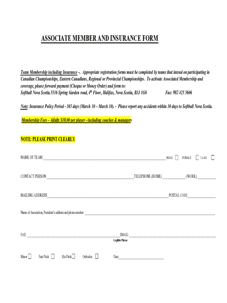 ASSOCIATE MEMBER AND INSURANCE FORMTeam Membership including Insurance . Appropriate registration forms must be completed by teams that intend on participating in Canadian Championships, Eastern Canadians,