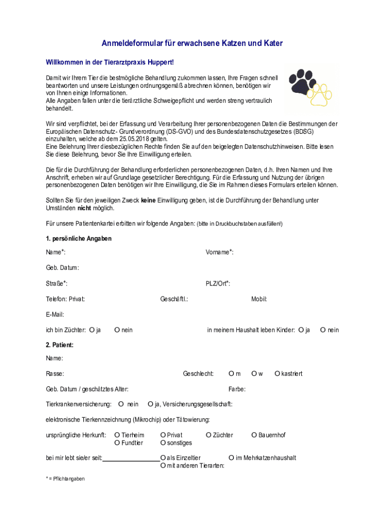 Anmeldeformular fr erwachsene Katzen und Kater Willkommen in der Tierarztpraxis Huppert! Damit wir Ihrem Tier die bestmgliche Behandlung zukommen lassen, Ihre Fragen schnell beantworten und unsere
