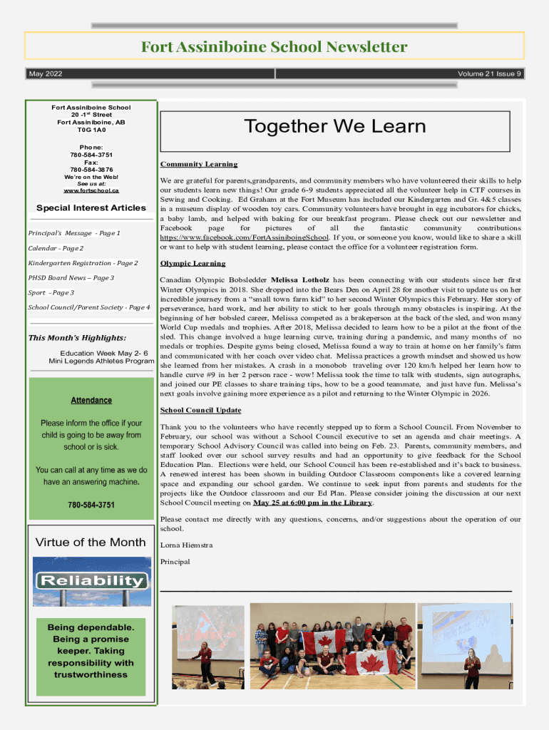 Fort Assiniboine School Newsletter May 2022Volume 21 Issue 9Fort Assiniboine School 20 1st Street Fort Assiniboine, AB T0G 1A0 Phone: 7805843751 Fax: 7805843876 Were on the Web! See us at: www.fortschool.caTogether