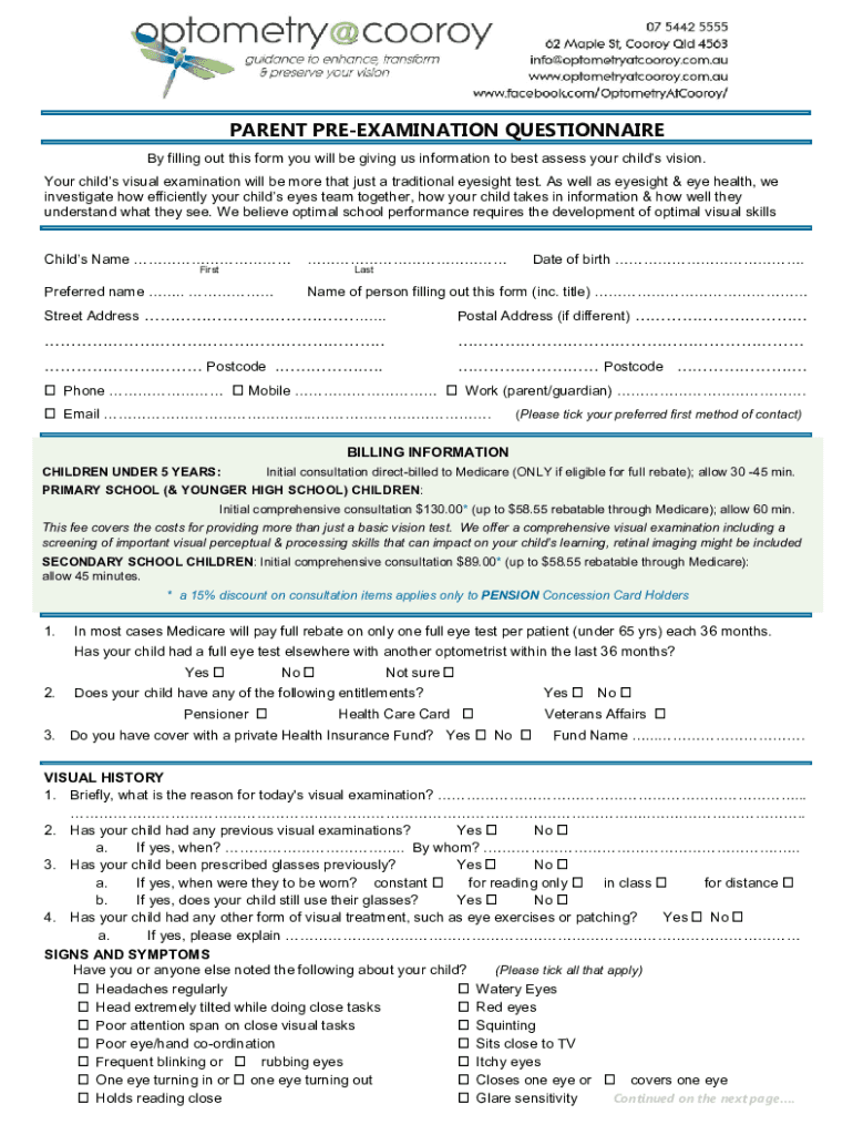 PARENT PREEXAMINATION QUESTIONNAIRE By filling out this form you will be giving us information to best assess your childs vision. Your childs visual examination will be more that just a traditional