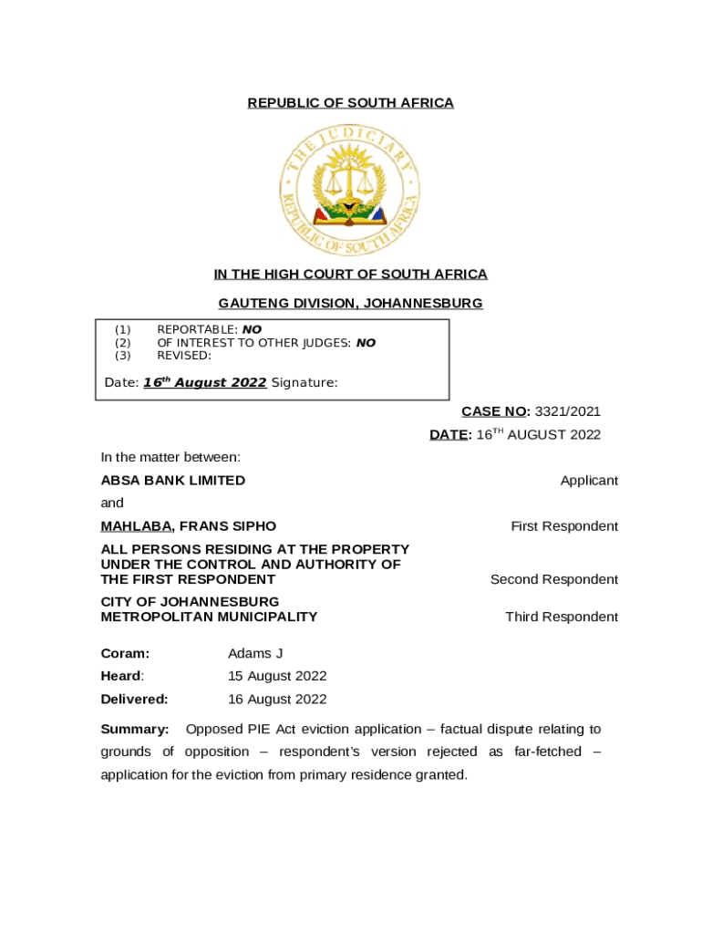 REPUBLIC OF SOUTH AFRICAIN THE HIGH COURT OF SOUTH AFRICA GAUTENG DIVISION, JOHANNESBURG (1) (2) (3)REPORTABLE: NO OF INTEREST TO OTHER JUDGES: NO REVISED:Date: 16th August 2022 Signature: ___CASE