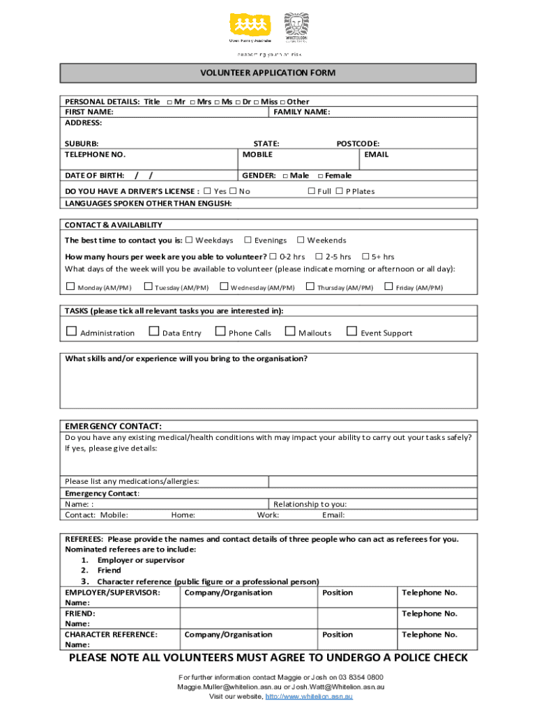 VOLUNTEER APPLICATION FORM PERSONAL DETAILS: Title Mr Mrs Ms Dr Miss Other FIRST NAME: FAMILY NAME: ADDRESS: SUBURB: TELEPHONE NO. DATE OF BIRTH:STATE: MOBILE //POSTCODE: EMAILGENDER: Male Female