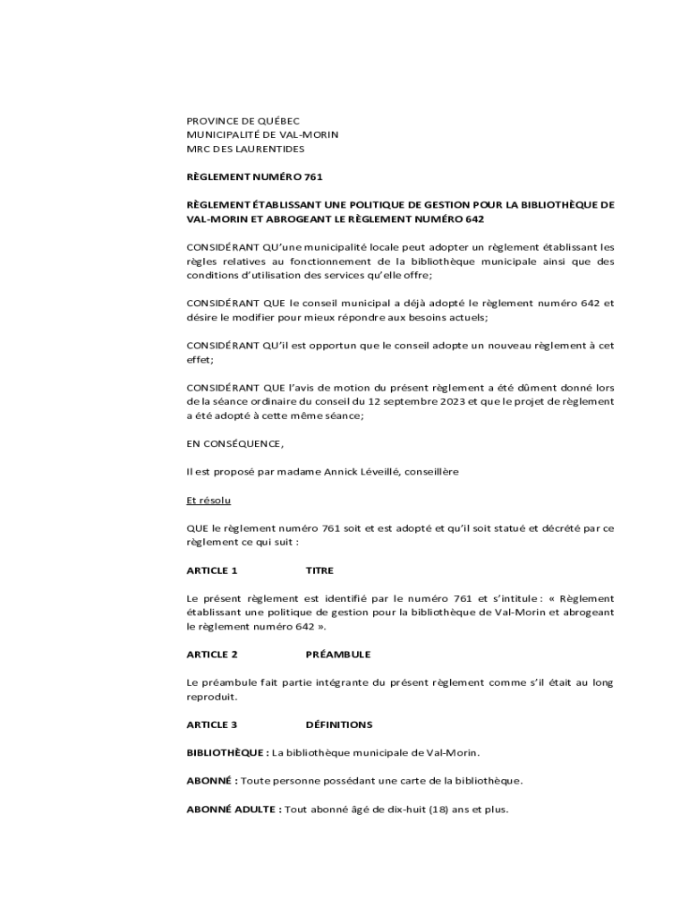 PROVINCE DE QUBEC MUNICIPALIT DE VALMORIN MRC DES LAURENTIDES RGLEMENT NUMRO 761 RGLEMENT TABLISSANT UNE POLITIQUE DE GESTION POUR LA BIBLIOTHQUE DE VALMORIN ET ABROGEANT LE RGLEMENT NUMRO 642 CONSIDRANT