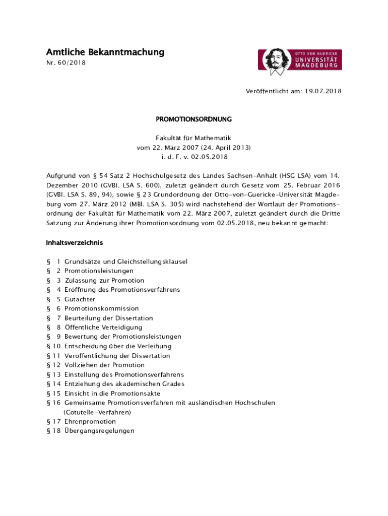 Amtliche Bekanntmachung Nr. 60/2018Verffentlicht am: 19.07.2018PROMOTIONSORDNUNG Fakultt fr Mathematik vom 22. Mrz 2007 (24. April 2013) i. d. F. v. 02.05.2018 Aufgrund von 54 Satz 2 Hochschulgesetz
