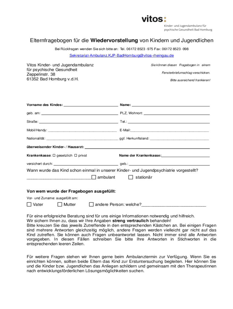 Elternfragebogen fr die Wiedervorstellung von Kindern und Jugendlichen Bei Rckfragen wenden Sie sich bitte an: Tel. 06172 8523 975 Fax: 06172 8523 998SekretariatAmbulanz.KJPBadHomburg@vitosrheingau.deVitos
