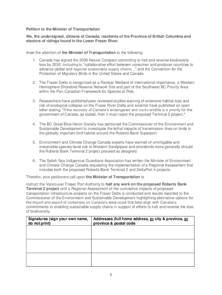 Petition to the Minister of Transportation We, the undersigned, citizens of Canada, residents of the Province of British Columbia and electors of ridings found in the Lower Fraser River, draw the
