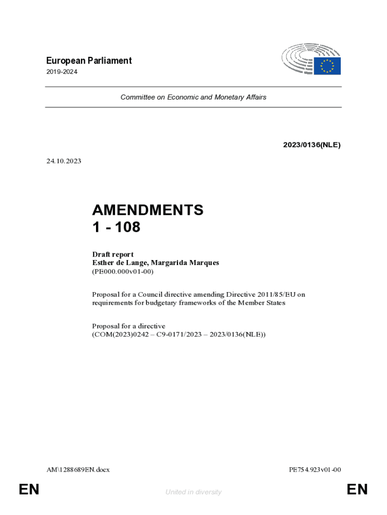 European Parliament 20192024Committee on Economic and Monetary Affairs2023/0136(NLE) 24.10.2023AMENDMENTS 1 108 Draft report Esther de Lange, Margarida Marques (PE000.000v0100) Proposal for a Council