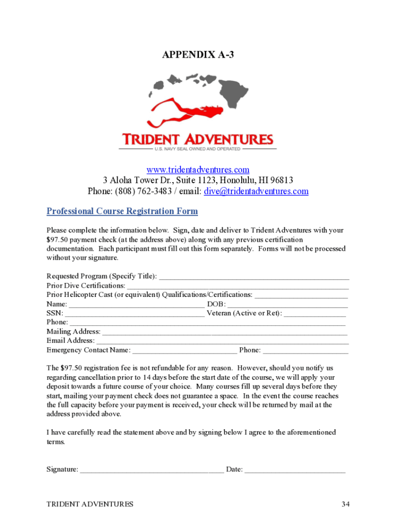 APPENDIX A3www.tridentadventures.com 3 Aloha Tower Dr., Suite 1123, Honolulu, HI 96813 Phone: (808) 7623483 / email: dive@tridentadventures.com Professional Course Registration Form Please complete
