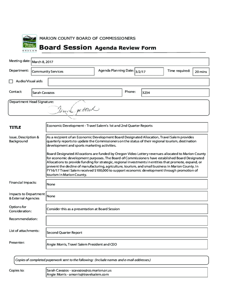 MARION COUNTY BOARD OF COMMISSIONERSBoard SessionAgenda Review FormMeeting date: March 8, 2017 Department: Community ServicesAgenda Planning Date: 3/2/17Time required:20 minsAudio/Visual aids Contact:Sarah