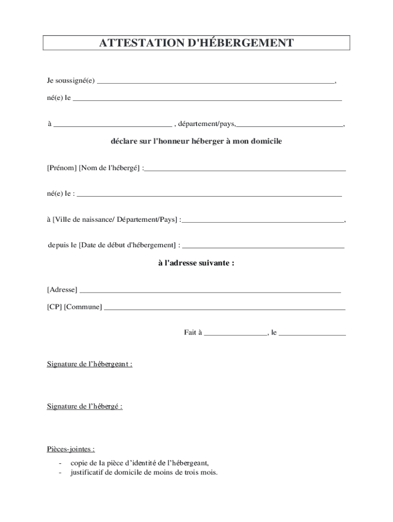 ATTESTATION D\'HBERGEMENTJe soussign(e) ___, n(e) le ___ ___ , dpartement/pays,___,dclare sur l\'honneur hberger mon domicile [Prnom] [Nom de l\'hberg] :___n(e) le : ___ [Ville de naissance/ Dpartement/Pays]