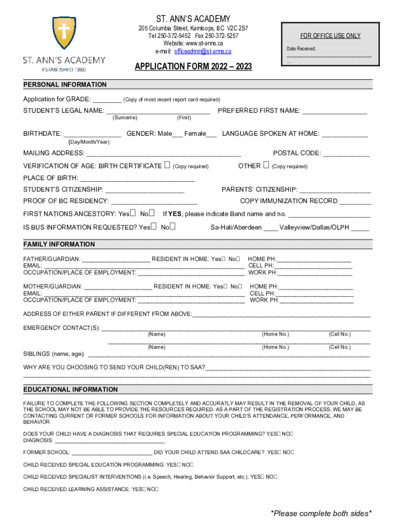 ST. ANNS ACADEMY 205 Columbia Street, Kamloops, BC V2C 2S7 Tel 2503725452 Fax 2503725257 Website: www.stanns.ca email: officeadmin@stanns.caFOR OFFICE USE ONLY Date Received: ___ __APPLICATION FORM