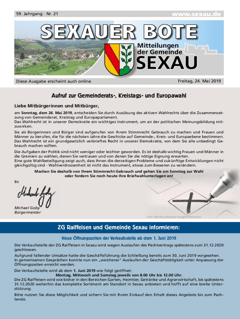 59. Jahrgang Nr. 21Mitteilungen der GemeindeSexau Freitag, 24. Mai 2019Diese Ausgabe erscheint auch onlineAufruf zur Gemeinderats, Kreistags und Europawahl Liebe Mitbrgerinnen und Mitbrger, am Sonntag,
