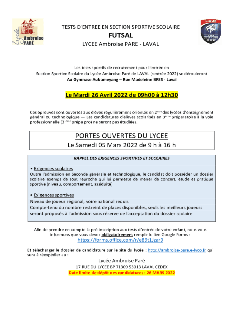 TESTS D\'ENTREE EN SECTION SPORTIVE SCOLAIREFUTSAL LYCEE Ambroise PARE LAVALLes tests sportifs de recrutement pour l\'entre en Section Sportive Scolaire du Lyce Ambroise Par de LAVAL (rentre 2022)