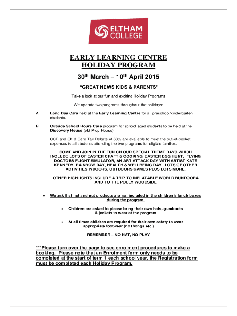 EARLY LEARNING CENTRE HOLIDAY PROGRAM 30th March 10th April 2015 GREAT NEWS KIDS & PARENTS Take a look at our fun and exciting Holiday Programs We operate two programs throughout the holidays: ALong