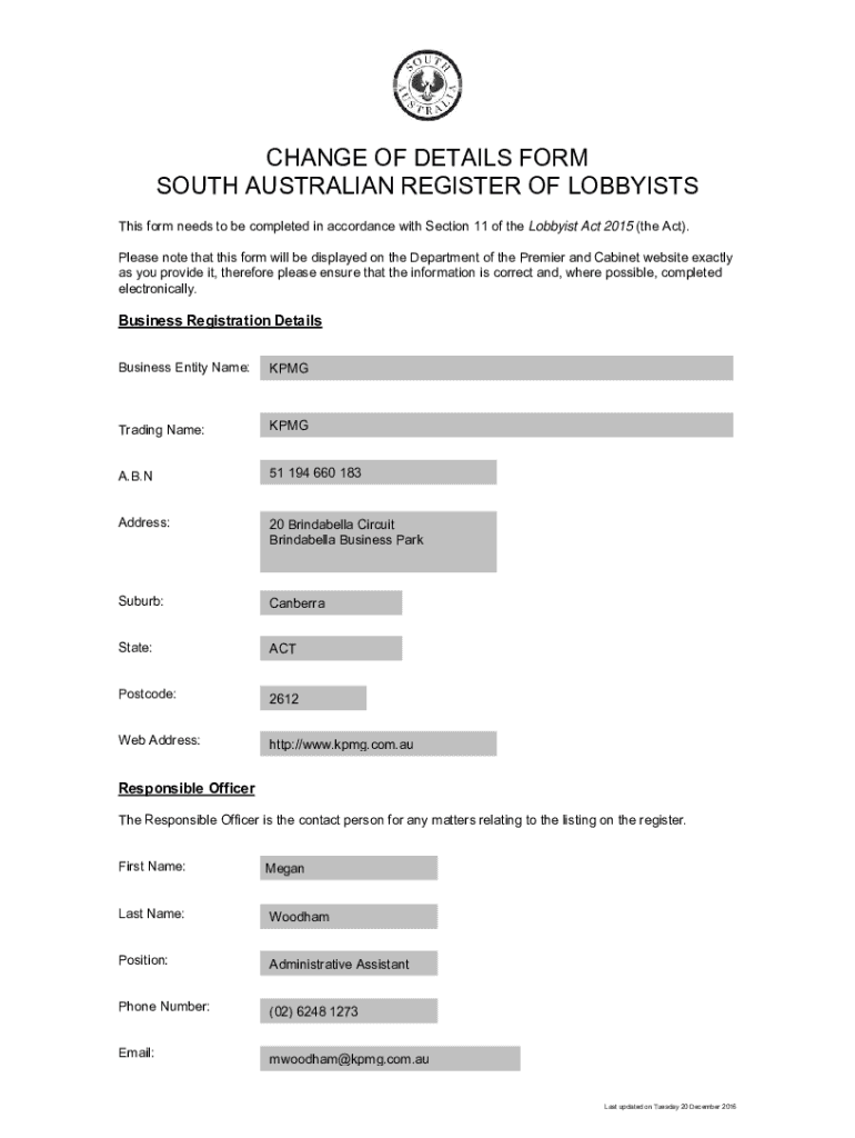 CHANGE OF DETAILS FORM SOUTH AUSTRALIAN REGISTER OF LOBBYISTS This form needs to be completed in accordance with Section 11 of the Lobbyist Act 2015 (the Act). Please note that this form will be displayed