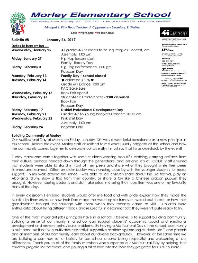 Principal: L. Pitt Head Teacher: J. Cipparrone Secretary: B. Walters Safe Welcome ResponsibleBulletin #8January 24, 2017Dates to Remember Wednesday, January 25 Friday, January 27 Friday, February
