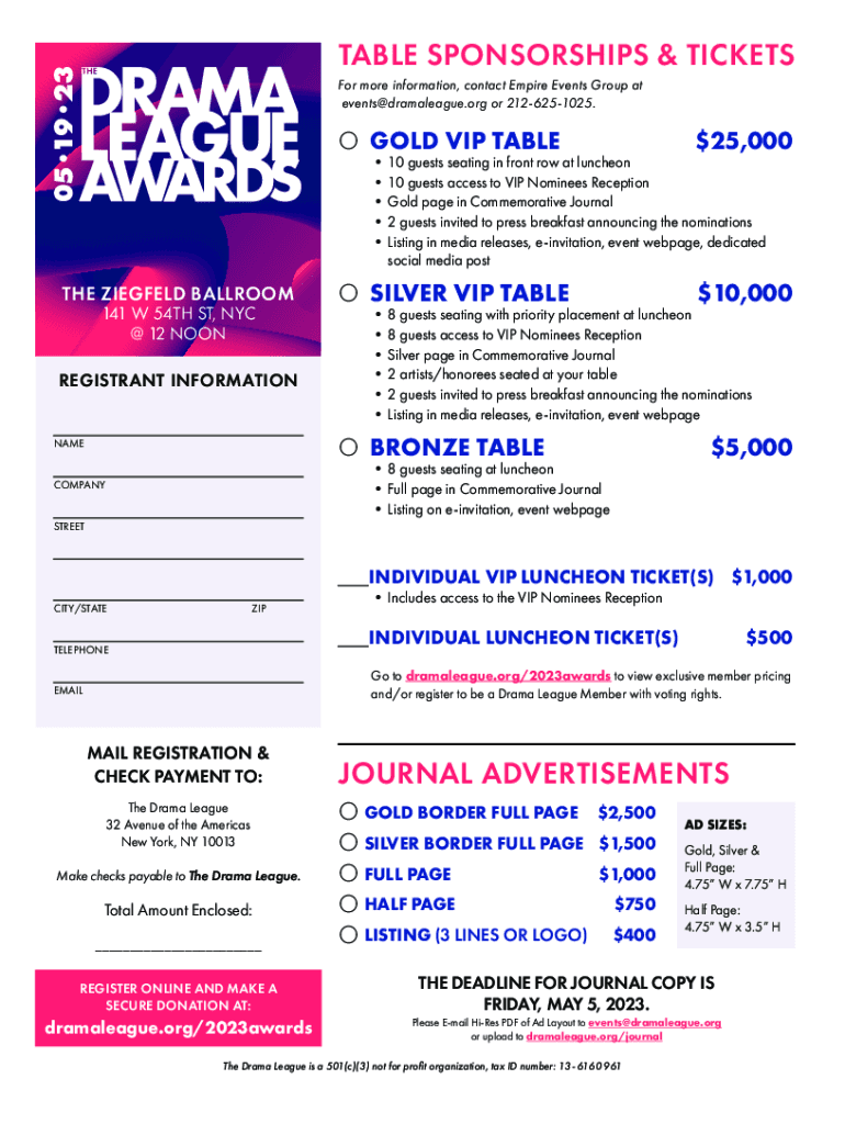 051923TABLE SPONSORSHIPS & TICKETS For more information, contact Empire Events Group at events@dramaleague.org or 2126251025. GOLD VIP TABLE$25,000 SILVER VIP TABLE$10,000 10 guests seating in front