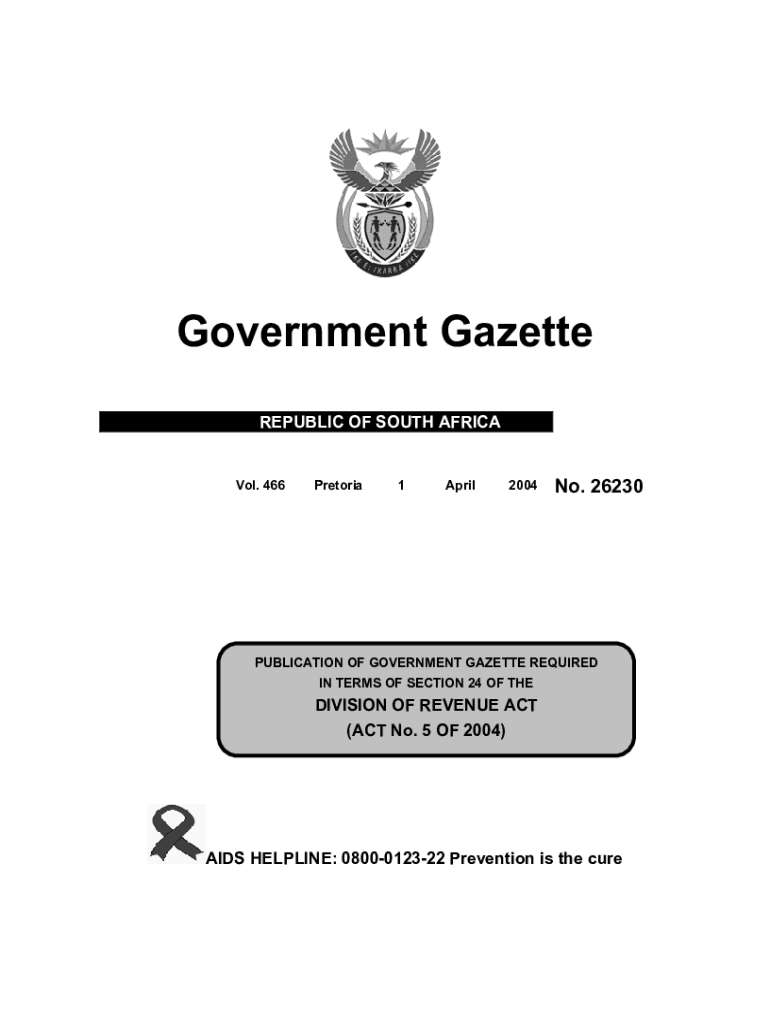 Government Gazette REPUBLIC OF SOUTH AFRICAVol. 466Pretoria1April2004No. 26230PUBLICATION OF GOVERNMENT GAZETTE REQUIRED IN TERMS OF SECTION 24 OF THEDIVISION OF REVENUE ACT (ACT No. 5 OF 2004)AIDS