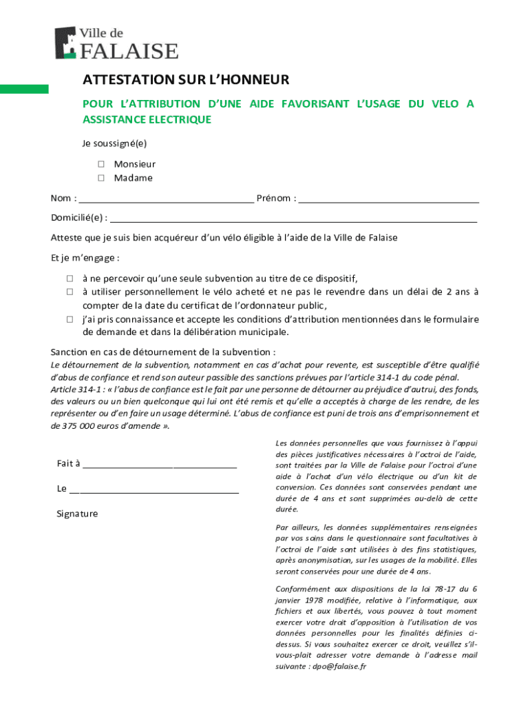ATTESTATION SUR LHONNEUR POUR LATTRIBUTION DUNE AIDE FAVORISANT LUSAGE DU VELO A ASSISTANCE ELECTRIQUE Je soussign(e) Monsieur Madame Nom : ___ Prnom : ___ Domicili(e) : ___ Atteste que je suis bien
