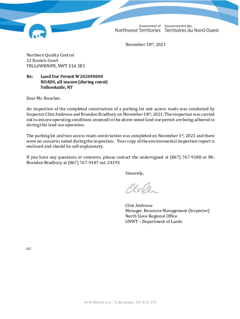 November 18th, 2021 Northern Quality Control 12 Daniels Court YELLOWKNIFE, NWT X1A 3K5 Re:Land Use Permit W2020F0004 ROADS, all season (during const) Yellowknife, NTDear Mr. Boucher, An inspection