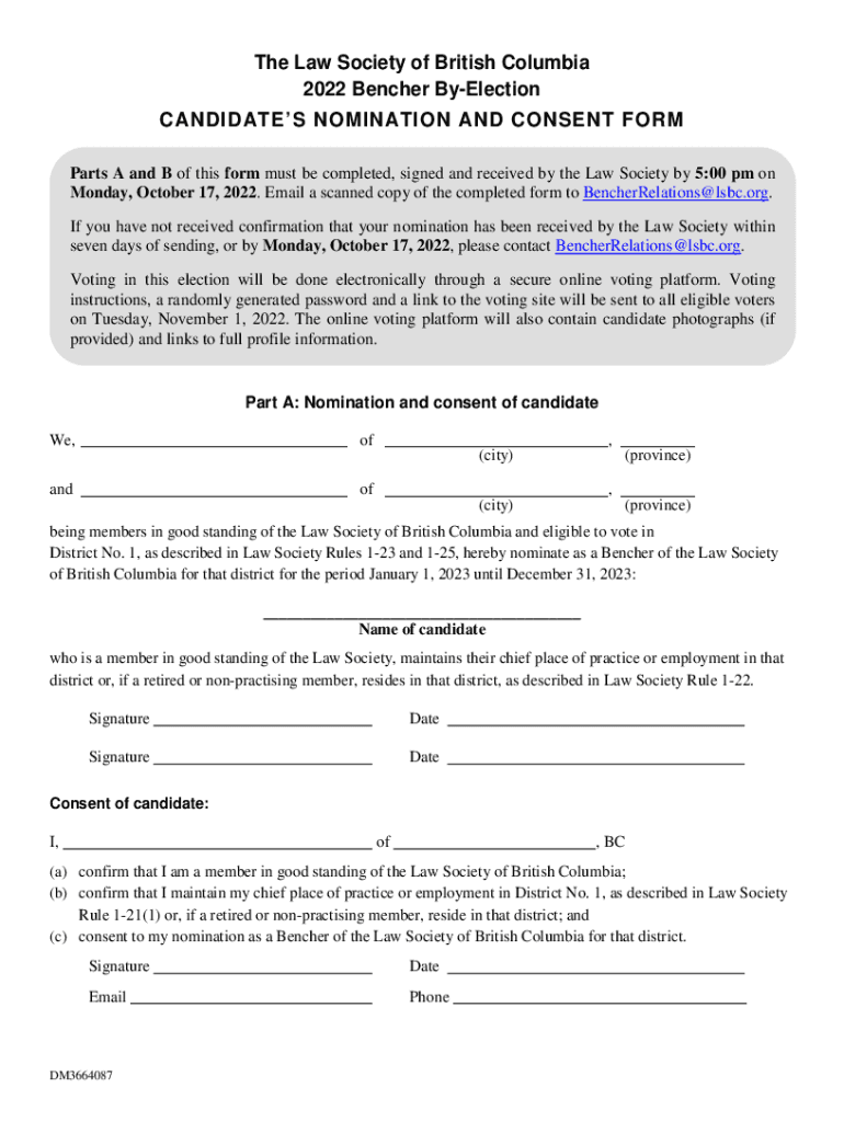 The Law Society of British Columbia 2022 Bencher ByElection CANDIDATES NOMINATION AND CONSENT FORM Parts A and B of this form must be completed, signed and received by the Law Society by 5:00 pm on
