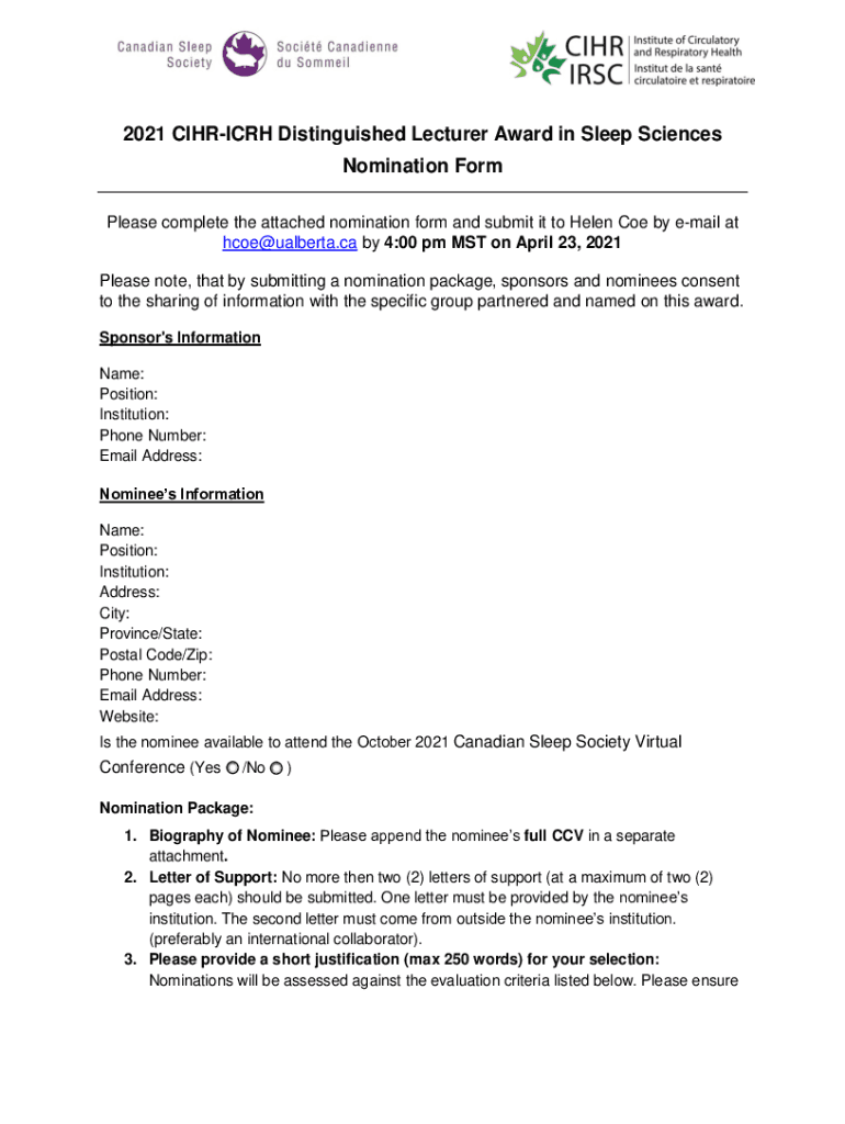 2021 CIHRICRH Distinguished Lecturer Award in Sleep Sciences Nomination Form Please complete the attached nomination form and submit it to Helen Coe by email at hcoe@ualberta.ca by 4:00 pm MST on
