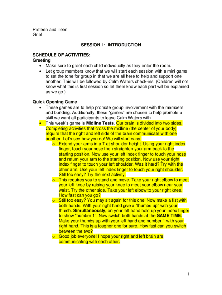 Preteen and Teen Grief SESSION I INTRODUCTION SCHEDULE OF ACTIVITIES: Greeting Make sure to greet each child individually as they enter the room. Let group members know that we will start each session