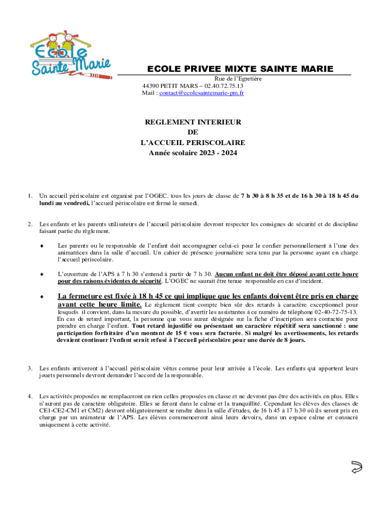 ECOLE PRIVEE MIXTE SAINTE MARIE Rue de lEgretire 44390 PETIT MARS 02.40.72.75.13 Mail : contact@ecolesaintemariepm.frREGLEMENT INTERIEUR DE LACCUEIL PERISCOLAIRE Anne scolaire 2023 20241.Un accueil