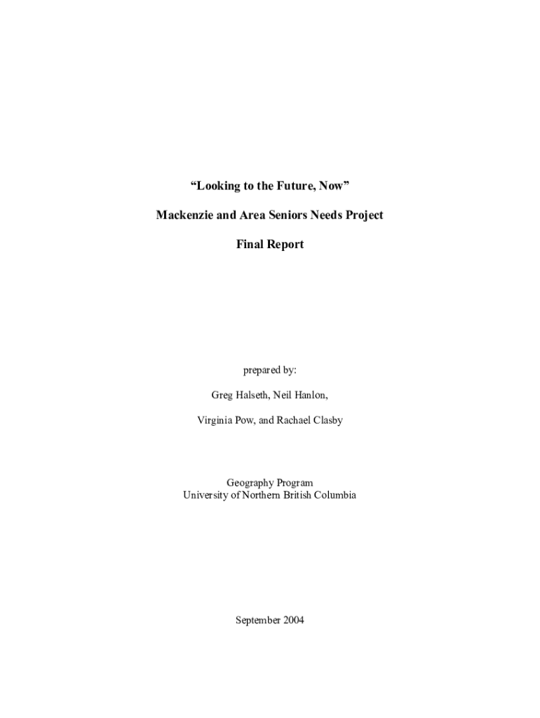 Looking to the Future, Now Mackenzie and Area Seniors Needs Project Final Reportprepared by: Greg Halseth, Neil Hanlon, Virginia Pow, and Rachael ClasbyGeography Program University of Northern British