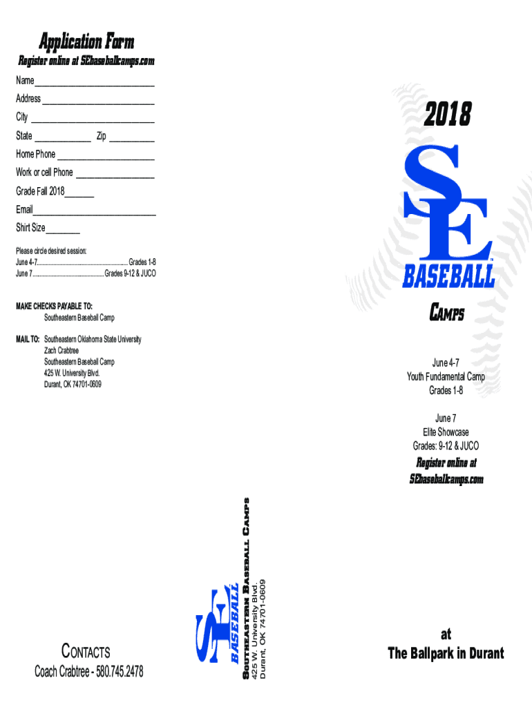 Application FormRegister online at SEbaseballcamps.com Name___ Address___2018City___ State___Zip___ Home Phone___ Work or cell Phone___ Grade Fall 2018___ Email___ Shirt Size___ Please circle desired