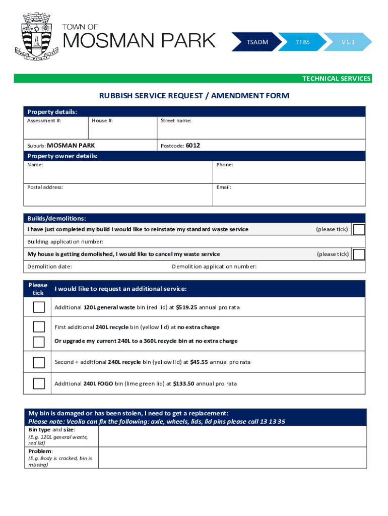 TSADMTF85V1.1TECHNICAL SERVICESRUBBISH SERVICE REQUEST / AMENDMENT FORM Property details: Assessment #:House #:Suburb: MOSMAN PARKStreet name:Postcode: 6012Property owner details: Name:Phone:Postal