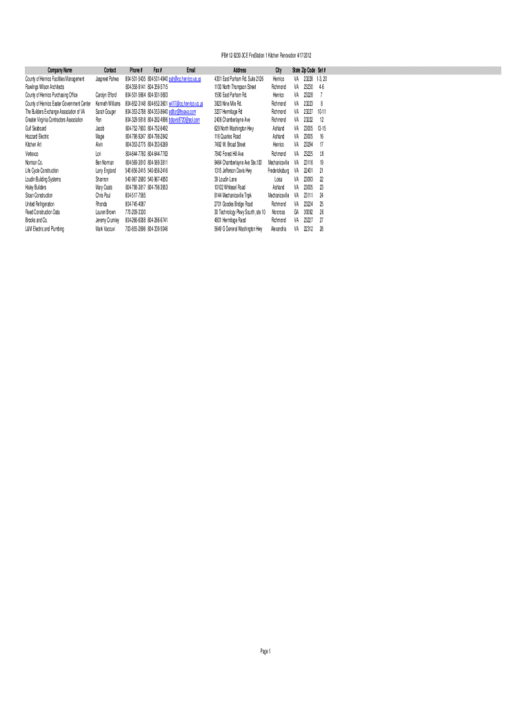 IFB# 1292303CE FireStation 1 Kitchen Renovation 4/17/2012 Company Name County of Henrico Facilities Management Rawlings Wilson Architects County of Henrico Purchasing Office County of Henrico Easter