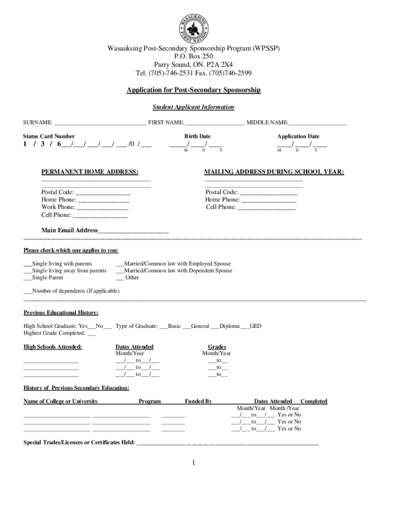Wasauksing PostSecondary Sponsorship Program (WPSSP) P.O. Box 250 Parry Sound, ON. P2A 2X4 Tel. (705)7462531 Fax. (705)7462599 Application for PostSecondary Sponsorship Student Applicant Information