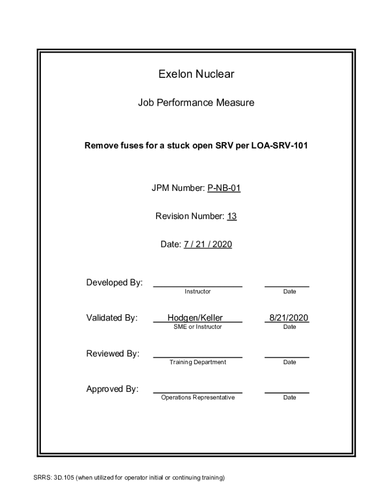 Nuclear Job Performance MeasureRemove fuses for a stuck open SRV per LOASRV101JPM Number: PNB01 Revision Number: 13 Date: 7 / 21 / 2020Developed By:Validated By:Reviewed By:Approved By:InstructorHodgen/Keller