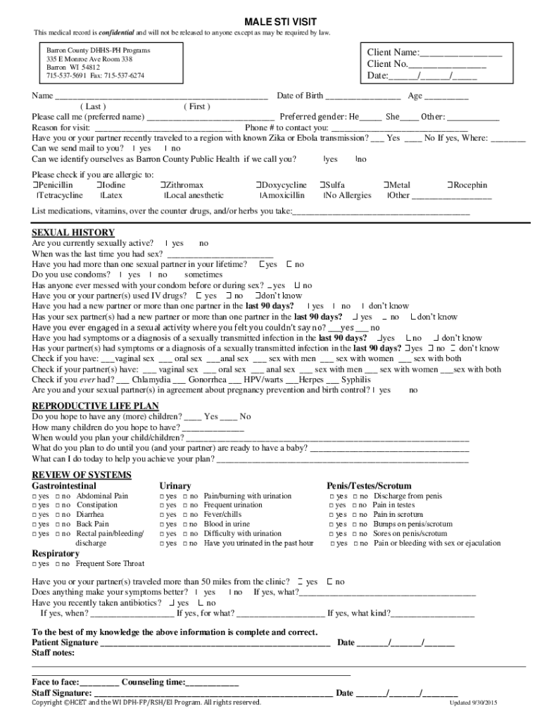 MALE STI VISIT This medical record is confidential and will not be released to anyone except as may be required by law. Barron County DHHSPH Programs 335 E Monroe Ave Room 338 Barron WI 54812 7155375691