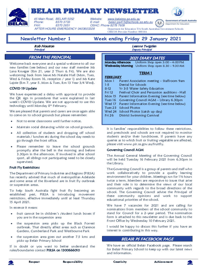 BELAIR PRIMARY NEWSLETTER 45 Main Road, BELAIR 5052 Website: www.belairps.sa.edu.au Phone: 8370 3733 Email: belair.ps415@schools.sa.edu.au FAX: 8370 2651 OSHC: Phone 8278 7609 AFTER HOURS EMERGENCY