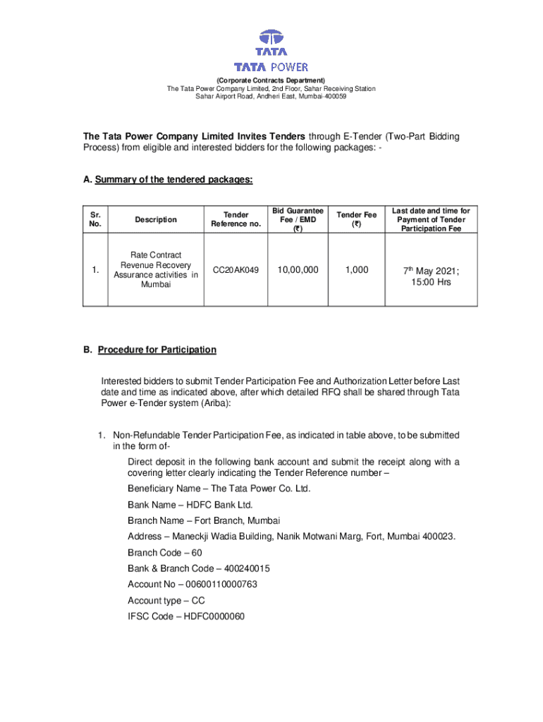 Get the free The Tata Power Company Limited Invites Tenders through E-Tender (Two-Part Bidding