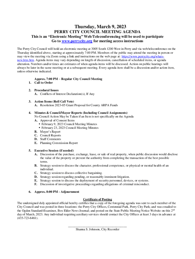 Thursday, March 9, 2023 PERRY CITY COUNCIL MEETING AGENDA This is an Electronic Meeting Web/Teleconferencing will be used to participate Go to www.perrycity.org for meeting access instructions The