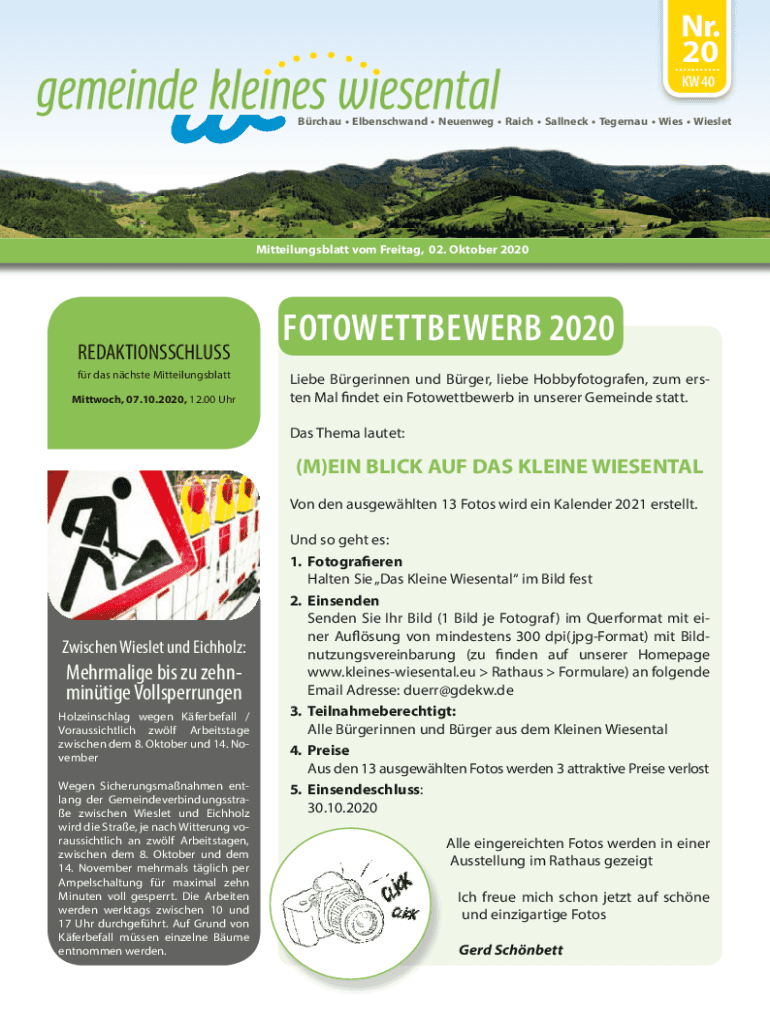 Nr. 20 KW 40 Brchau Elbenschwand Neuenweg Raich Sallneck Tegernau Wies WiesletMitteilungsblatt vom Freitag, 02. Oktober 2020REDAKTIONSSCHLUSS fr das nchste Mitteilungsblatt Mittwoch, 07.10.2020, 12.00