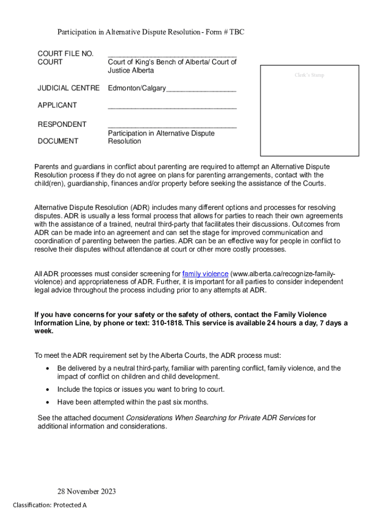 Participation in Alternative Dispute Resolution Form # TBC COURT FILE NO. COURT___ Court of Kings Bench of Alberta/ Court of Justice AlbertaJUDICIAL CENTREEdmonton/Calgary___APPLICANT___RESPONDENT___