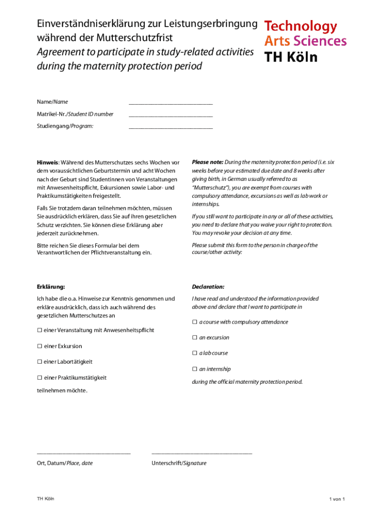 Einverstndniserklrung zur Leistungserbringung whrend der Mutterschutzfrist Agreement to participate in studyrelated activities during the maternity protection period Name/Name___MatrikelNr./Student