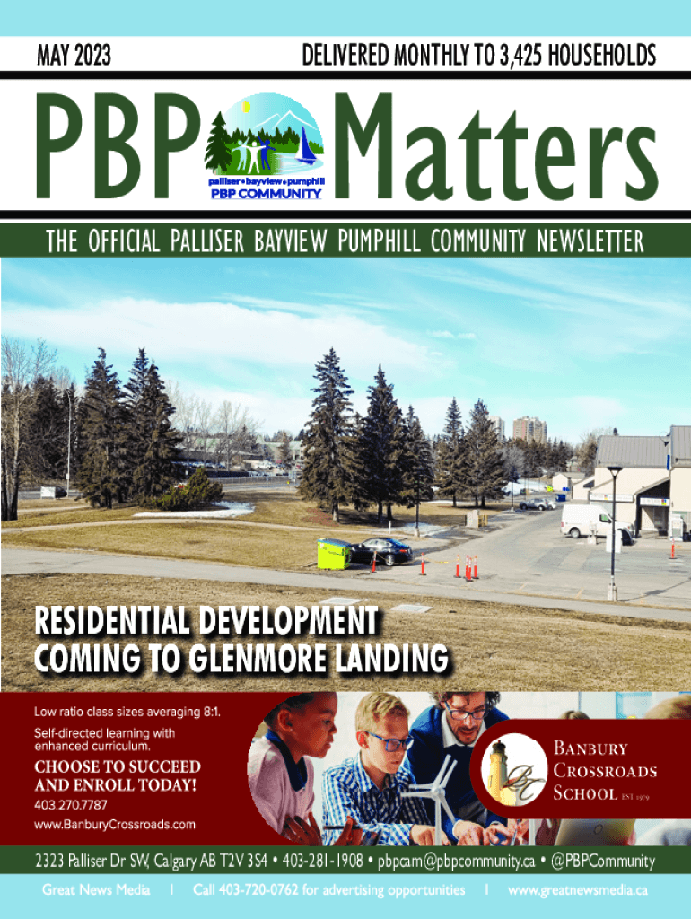 MAY 2023DELIVERED MONTHLY TO 3,425 HOUSEHOLDSPBP Matters THE OFFICIAL PALLISER BAYVIEW PUMPHILL COMMUNITY NEWSLETTERRESIDENTIAL DEVELOPMENT COMING TO GLENMORE LANDING2323 Palliser Dr SW, Calgary AB