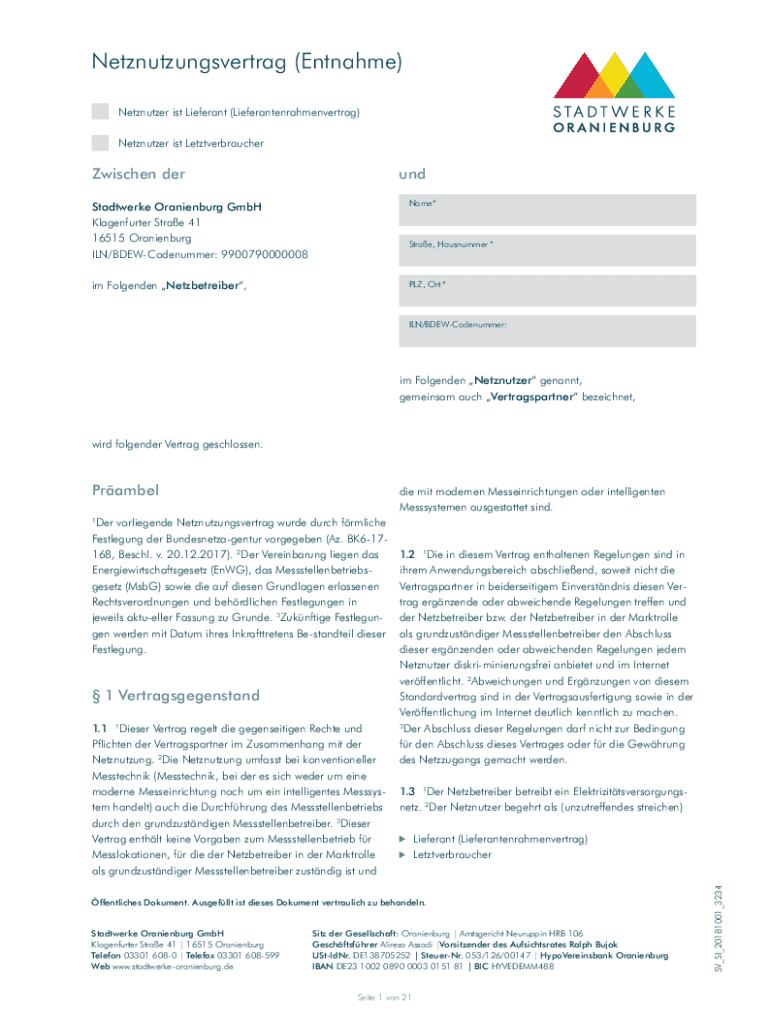 Netznutzungsvertrag (Entnahme) Netznutzer ist Lieferant (Lieferantenrahmenvertrag) Netznutzer ist LetztverbraucherZwischen derundStadtwerke Oranienburg GmbH Klagenfurter Strae 41 16515 Oranienburg