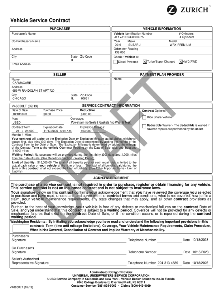 Vehicle Service Contract PURCHASERVEHICLE INFORMATIONPurchaser\'s NameVehicle Identification Number JF1VA1E65G8803975 Year Make 2016 SUBARU Odometer Reading 138,000 Check if vehicle is:CoPurchaser\'s