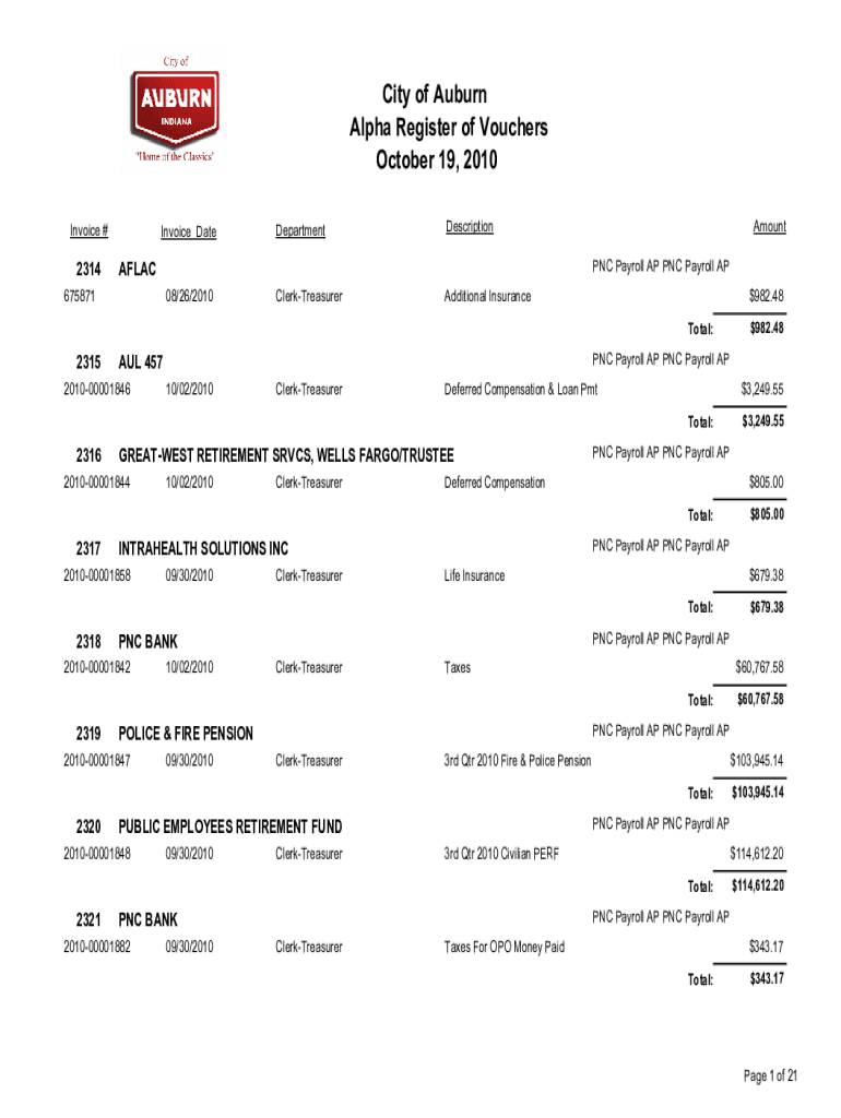City of Auburn Alpha Register of Vouchers October 19, 2010 Invoice #2314Invoice_DateDepartmentDescription PNC Payroll AP PNC Payroll APAFLAC675871Amount08/26/2010ClerkTreasurerAdditional Insurance$982.48