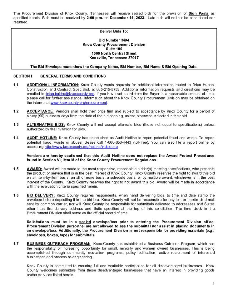 The Procurement Division of Knox County, Tennessee will receive sealed bids for the provision of Sign Posts as specified herein. Bids must be received by 2:00 p.m. on December 14, 2023. Late bids