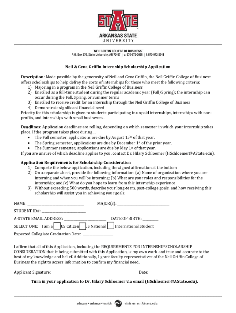 Neil & Gena Griffin Internship Scholarship Application Description: Made possible by the generosity of Neil and Gena Griffin, the Neil Griffin College of Business offers scholarships to help defray